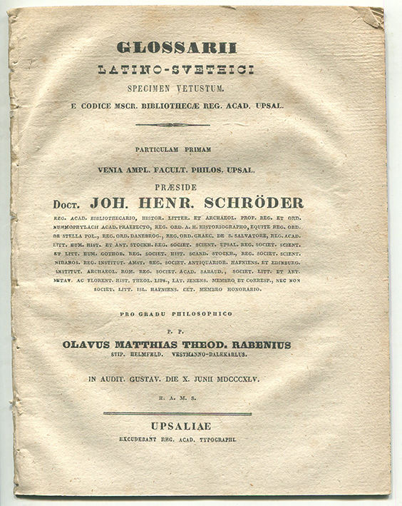 Glossarii latino-svethici specimen vetustum. E codice mscr. bibliothecæ reg. acad. Upsal. I-II. A.a.