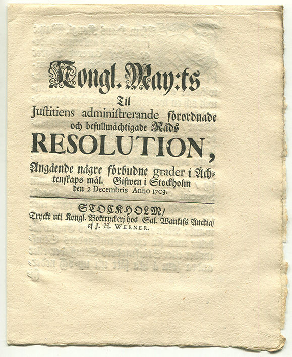 Kongl. may:ts til justitiens administrerande förordnade och befullmächtigade råds resolution, angående någre förbudne grader i ächtenskaps mål. Gifwen i Stockholm den 2 decembris anno 1703.
