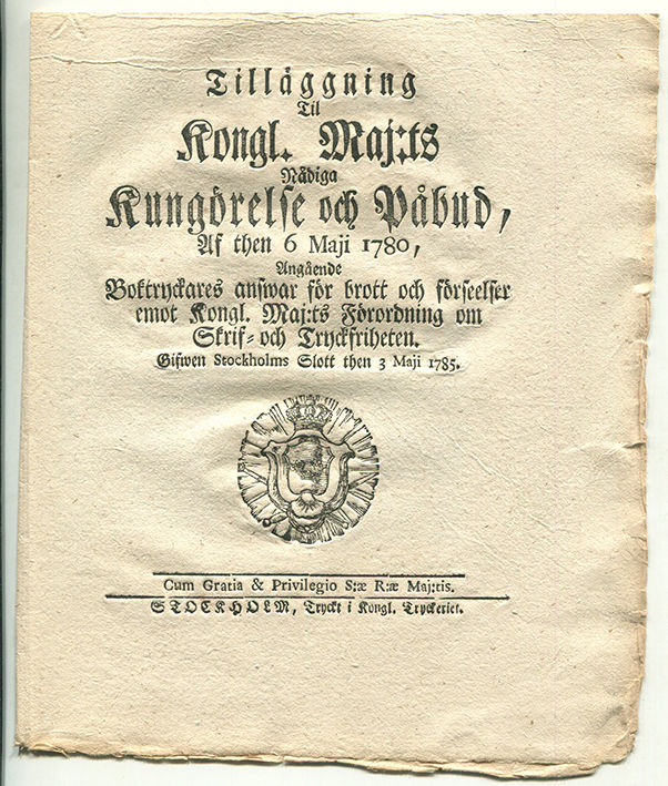Tilläggning til kongl. maj:ts nådiga kungörelse och påbud, af then 6 maji 1780, angående boktryckares answar för brott och förseelser emot kongl. maj:ts förordning om skrif- och tryckfriheten. Gifwen Stockholms slott then 3 maji 1785.