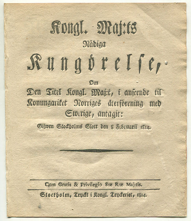 Kongl. maj:ts nådiga kungörelse, om den titel kongl. maj:t, i anseende til konungariket Norriges återförening med Swerige, antagit: gifwen Stockholms slott den 8 februarii 1814.