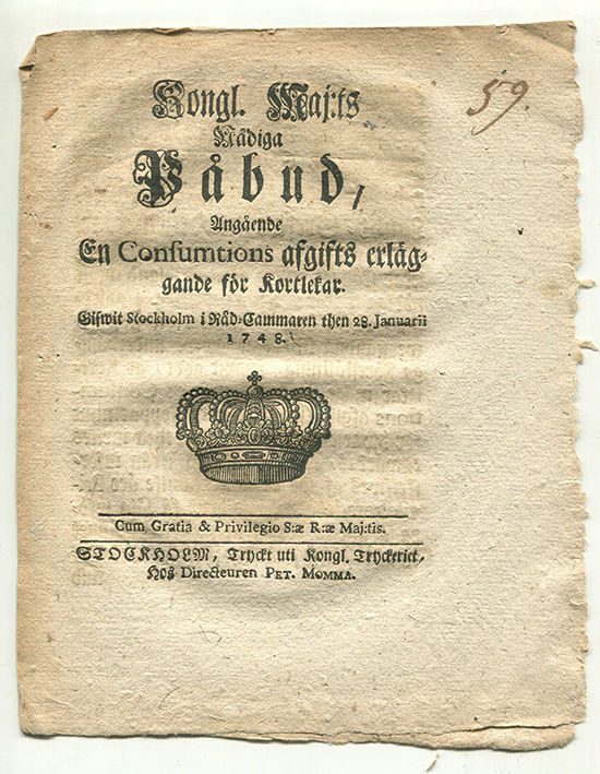 Kongl. maj:ts nådiga påbud/ angående en consumtions afgifts erläggande för kortlekar. Gifwit Stockholm i råd-cammaren then 28 januarii 1748.