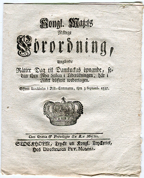 Kongl. maj:ts nådige förordning, angående rätter dag til damluckas öpnande, sedan then nya stilen i tideräkningen, här i riket blifwit wedertagen. Gifwen Stockholm i råd-cammaren, then 3 septemb. 1755.