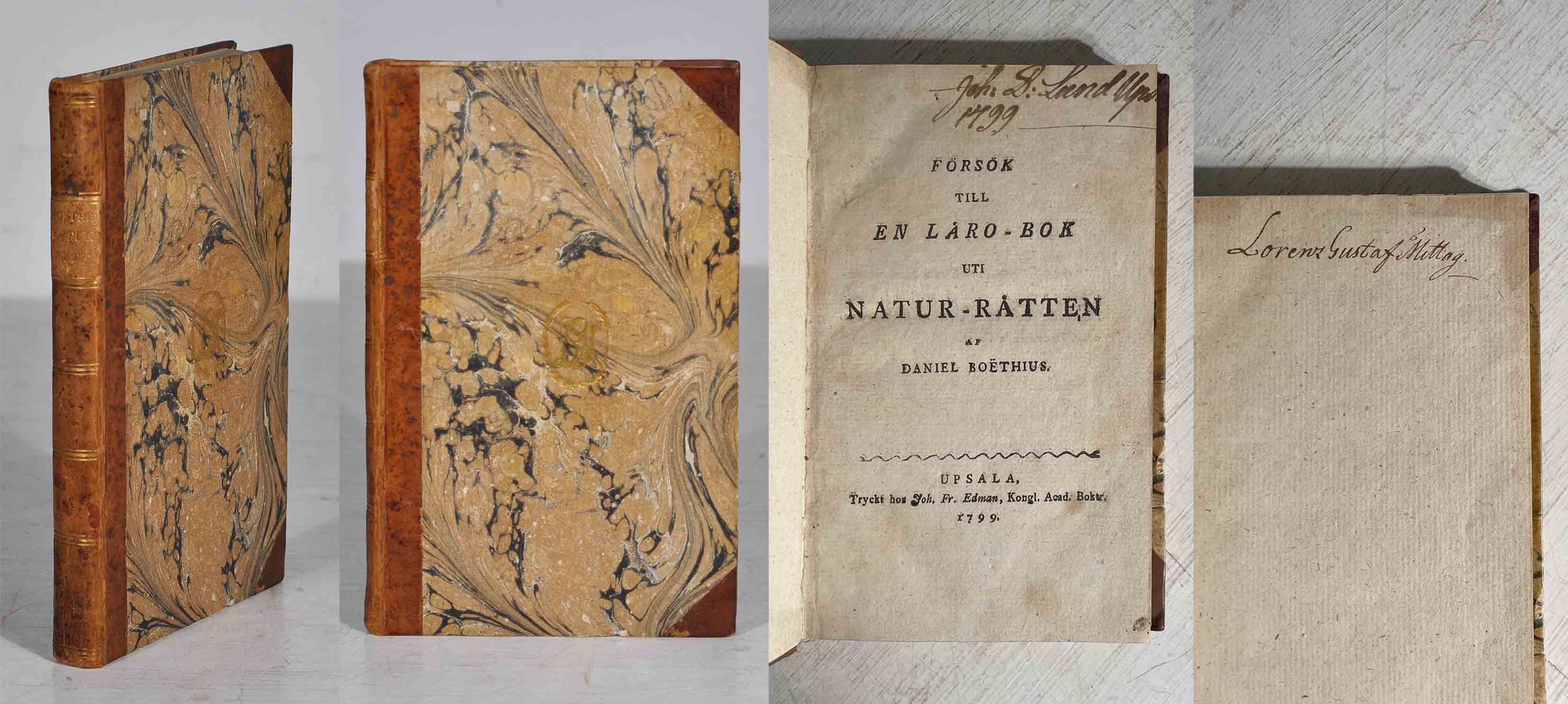 Uppsala, J. F. Edman, 1799. 8:o. (6),245,(1) s. Stänkdekorerat brunt hfrbd med guldlinjerad rygg och ljusbrun titeletikett. Gula snitt. Titelbladet lätt bruntonat och småfläckiga marginaler mot slutet. På titelbladet namnteckning Joh: D: Sand daterad Uppsala 1799. På försättsbladet namnteckning Lorenz Gustaf Mittag och densammes guldtryckta monogram ”LGM” inom oval bladkrans på frampärmen. Trevligt ex.
