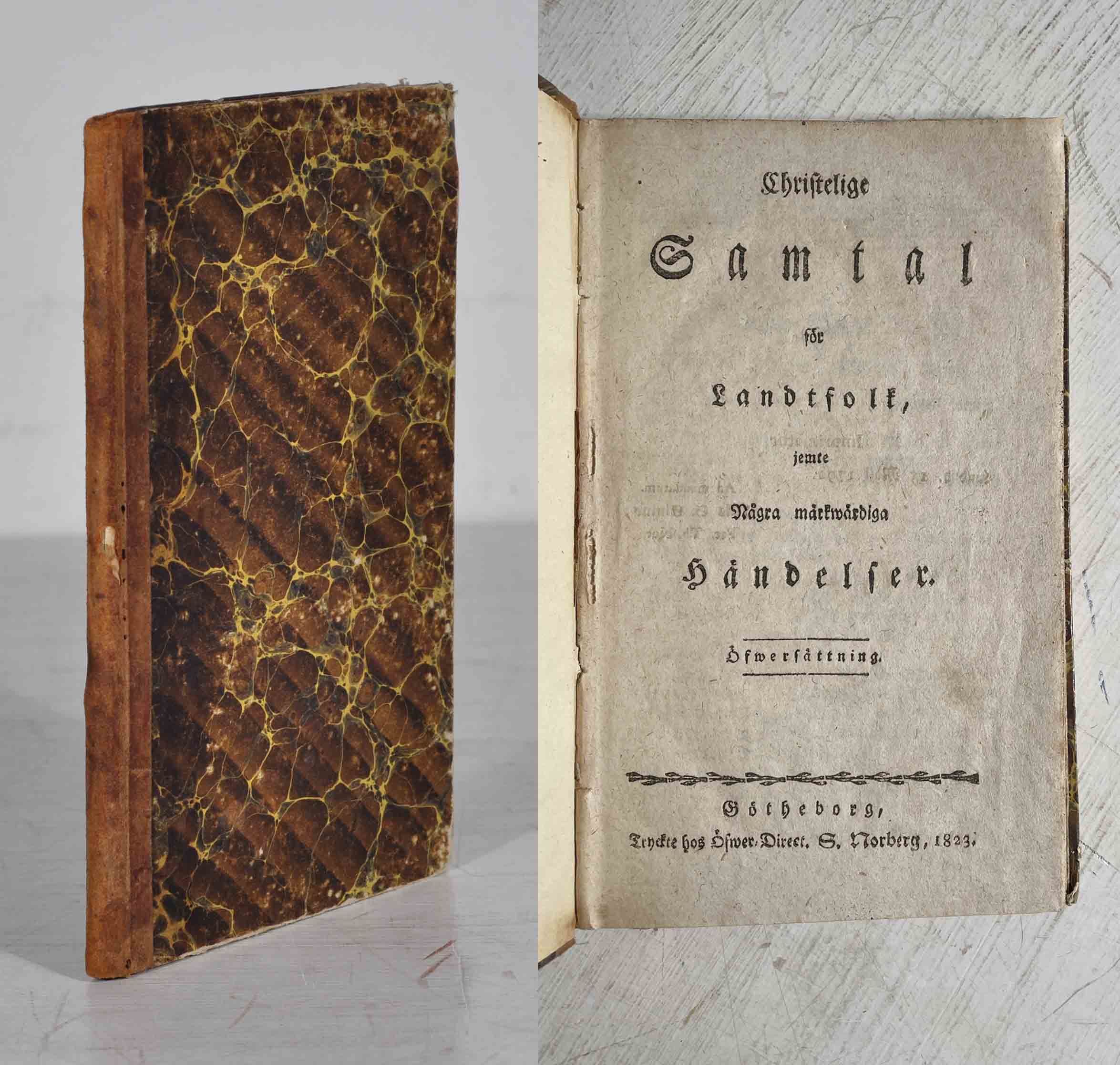 Göteborg, S. Norberg, 1823. 8:o. 72 s. Brunt enkelt hfrbd från 1800-talets mitt. Liten skada mitt på ryggen och några maskhål i främre ytterfalsen. Enstaka fläckar, t.ex. i nedre hörnet på s. 69. Namnteckning John Frison.