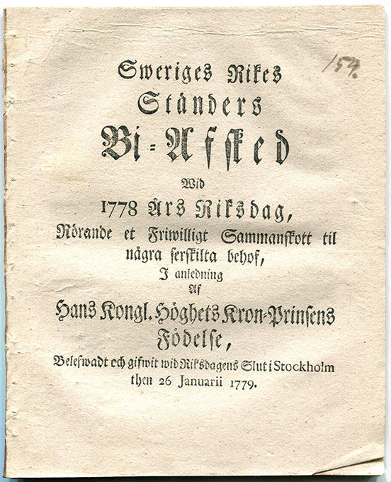 Sweriges rikes ständers bi-afsked wid 1778 års riksdag, rörande et friwilligt sammanskott til några serskilta behof, i anledning af hans kongl. höghets kron-prinsens födelse, belefwadt och gifwit wid riksdagens slut den 26 januarii 1779. 4:o. (4) s. + Kongl. maj:ts nådiga författning, angående upbörden af then bewiljade afgiften til faddergåfwan. Stockholms slott then 11 februarii 1779.