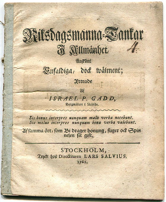 Bring Riksdagshandlingar s. 55. Tilltryckt motto på titelbladet; ”Af samma ört, som bi drager honung, suger ock spinnelen sit gift.” Israel Persson Gadd (troligen död 1768) var borgmästare i Skövde. Om Sveriges inrikes läge och bekymmer med många historiska hänvisningar, inte minst till antiken.