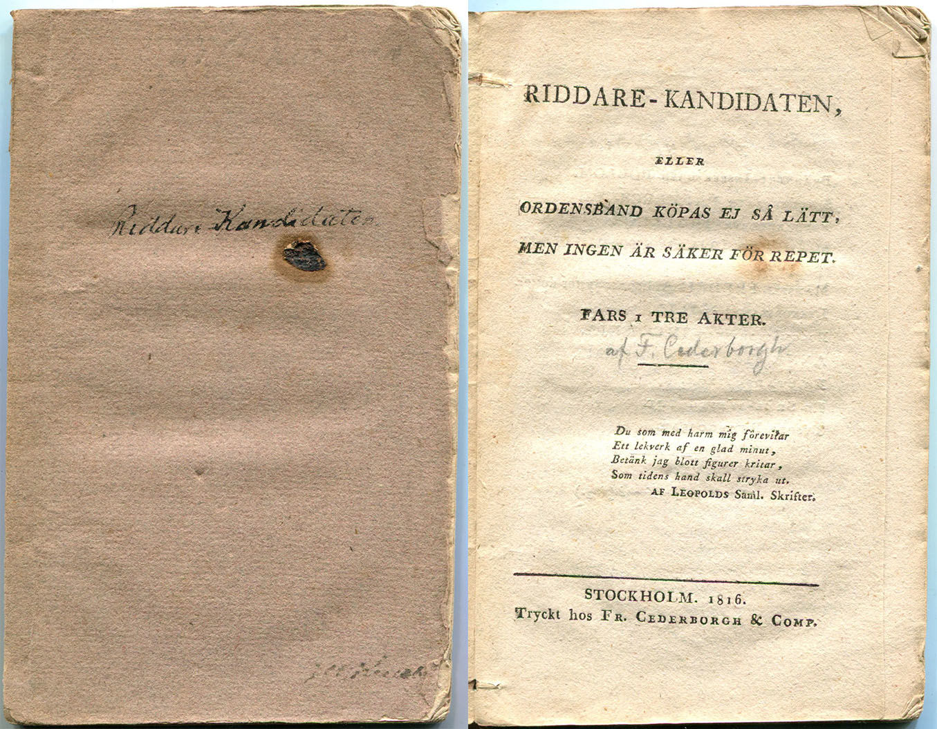 Klemming Sveriges dramatiska literatur s. 206. ”Scenen är W–köping”. Bland rollfigurerna återfinns bokhandlaren Tralling. ”Svenskt biografiskt lexikon” skriver: ”År 1816 hopskrev C. även en fars – medan han på en gästgivargård väntade på skjutshästar – kallad »Riddarekandidaten»; den utgjorde en provisorisk avslutning på Ottar Trallings historia, men hör till hans svagare verk”.