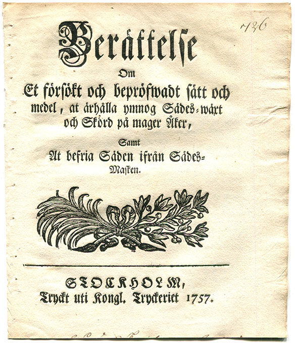 Berättelse om et försökt och bepröfwadt sätt och medel, at ärhålla ymnog sädes-wäxt och skörd på mager åker, samt at befria säden ifrån sädes-masken.