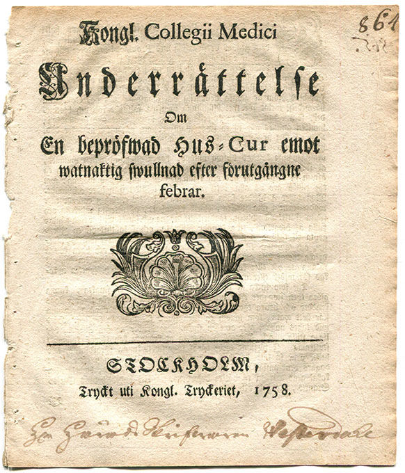 Kongl. Collegii medici underrättelse om en bepröfwad hus-cur emot watnaktig swullnad efter förutgångne febrar.