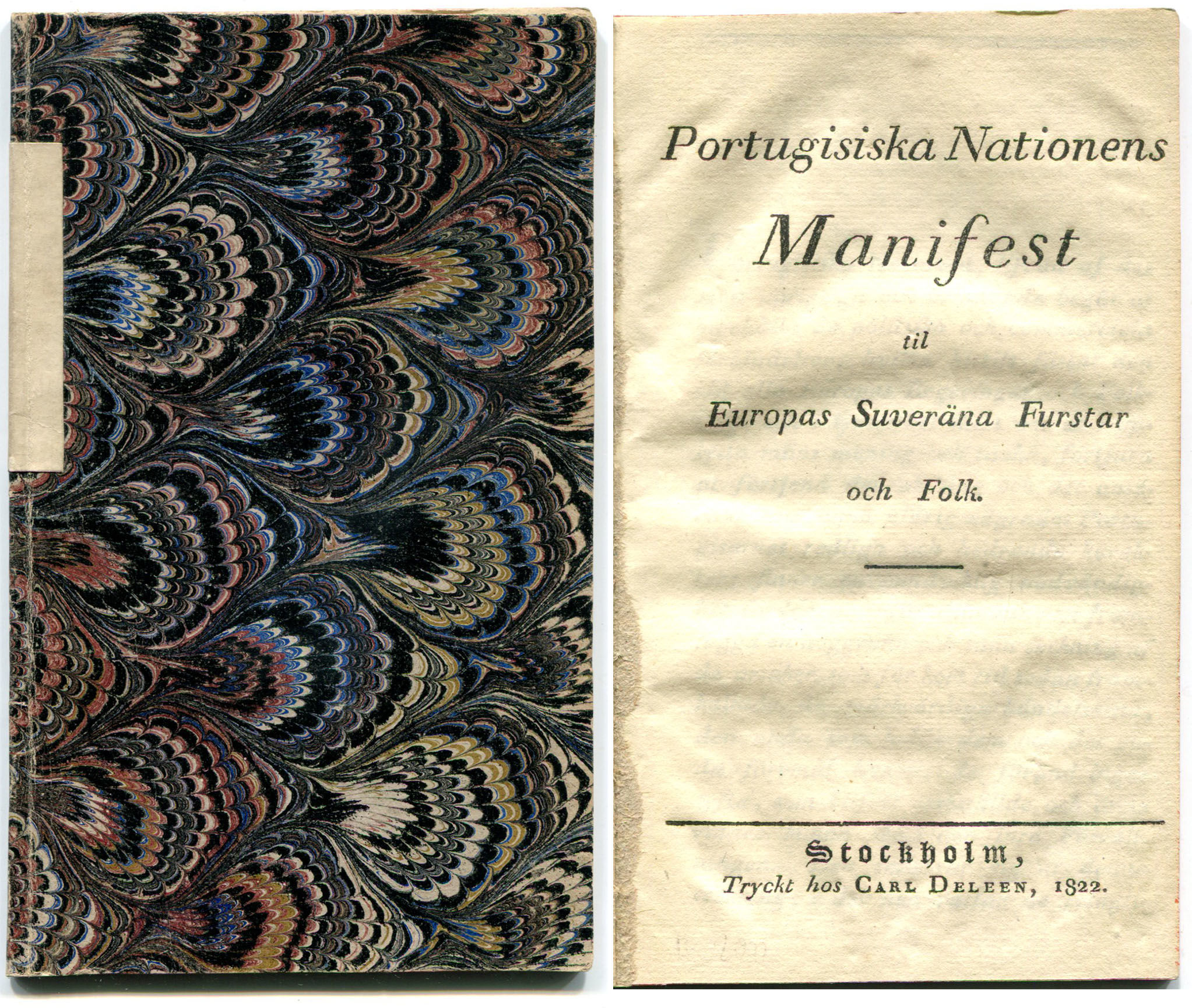 Sthlm, C. Deleen, 1822. Liten 8:o. 37 s. Tagen ur band och insatt i marmorerat pappomslag från slutet av 1800-talet med blank etikett runt ryggen. Med gamla rödstänkta snitt. Bra ex.