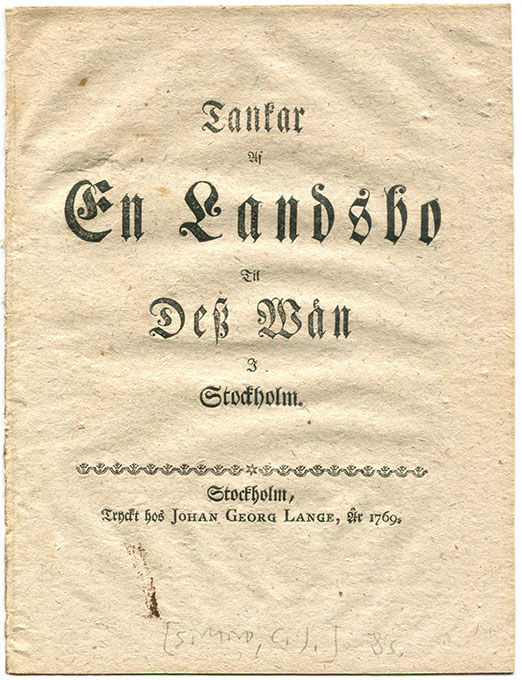Sthlm, J. G. Lange, 1769. 4:o. 8 s. Tagen ur band. Enstaka lagerfläckar. Litet bläckstråk i titelsidans nedre marginal.