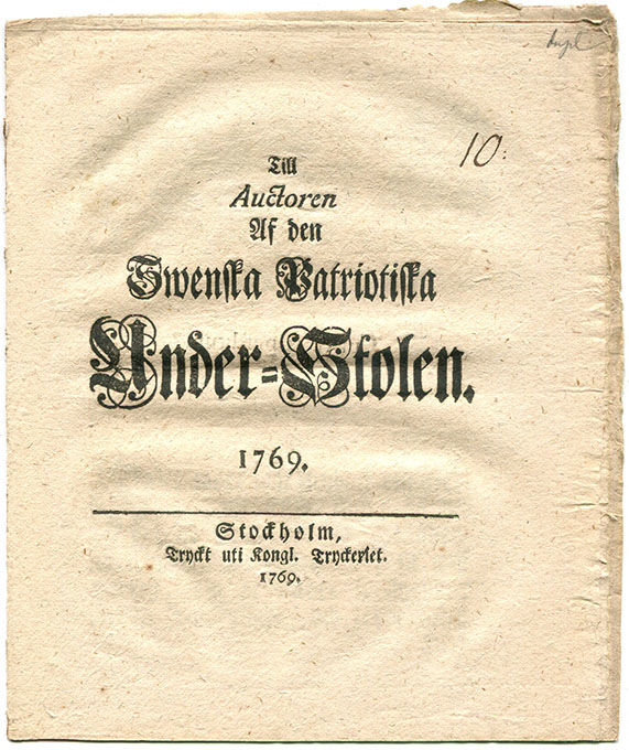 Sthlm, Kongl. tryckeriet, 1769. 4:o. 8 s. Tagen ur band. Råkanter i högermarginalen. Med gammal bläcknumrering 10. Kungliga bibliotekets diskreta duplettmarkering i blyerts. Bra ex.