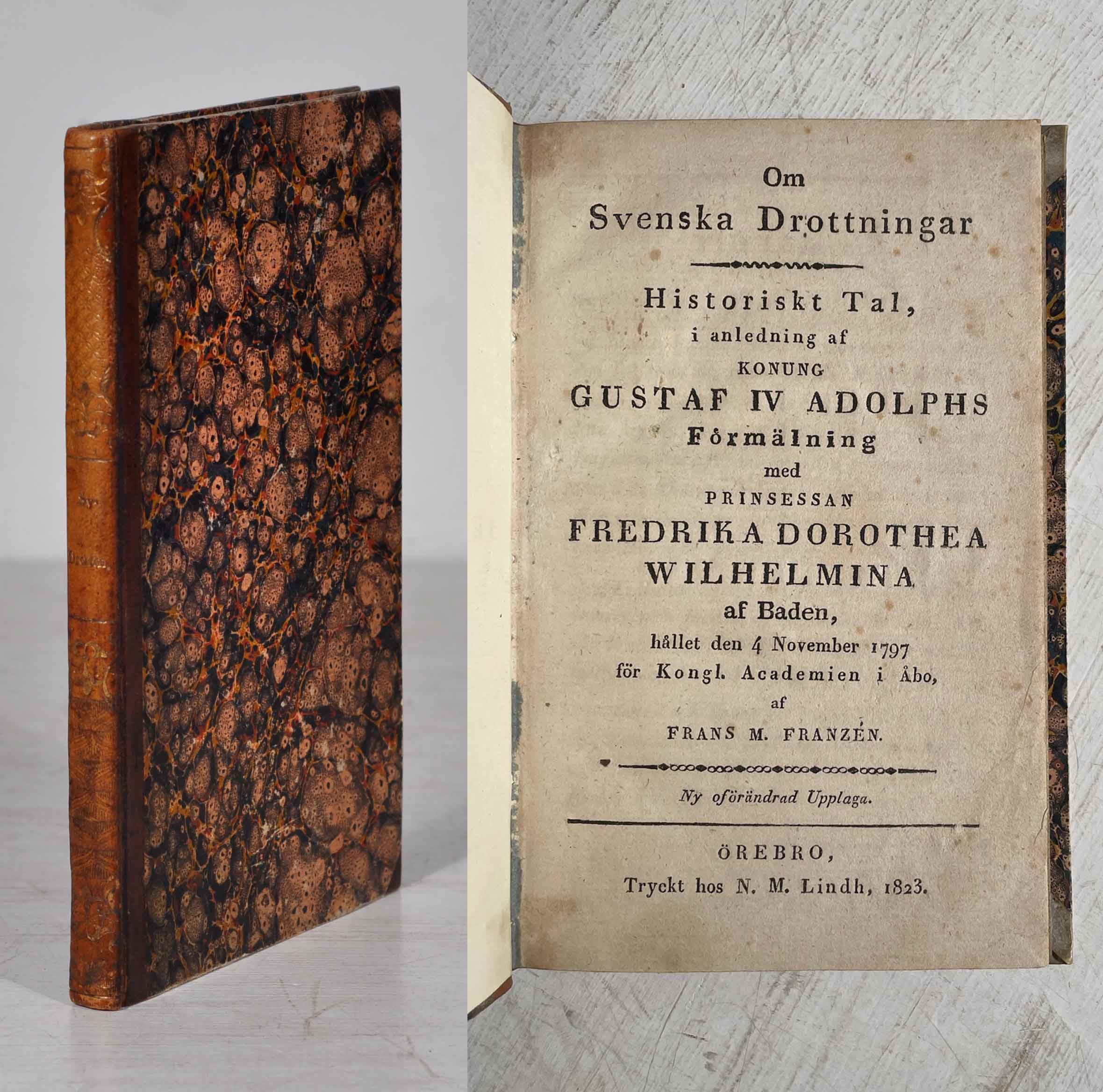 Om svenska drottningar. Historiskt tal, i anledning af konung Gustaf IV Adolphs förmälning med prinsessan Fredrika Dorothea Wilhelmina af Baden, hållet den 4 november 1797 för kongl. academien i Åbo. Ny oförändrad upplaga.