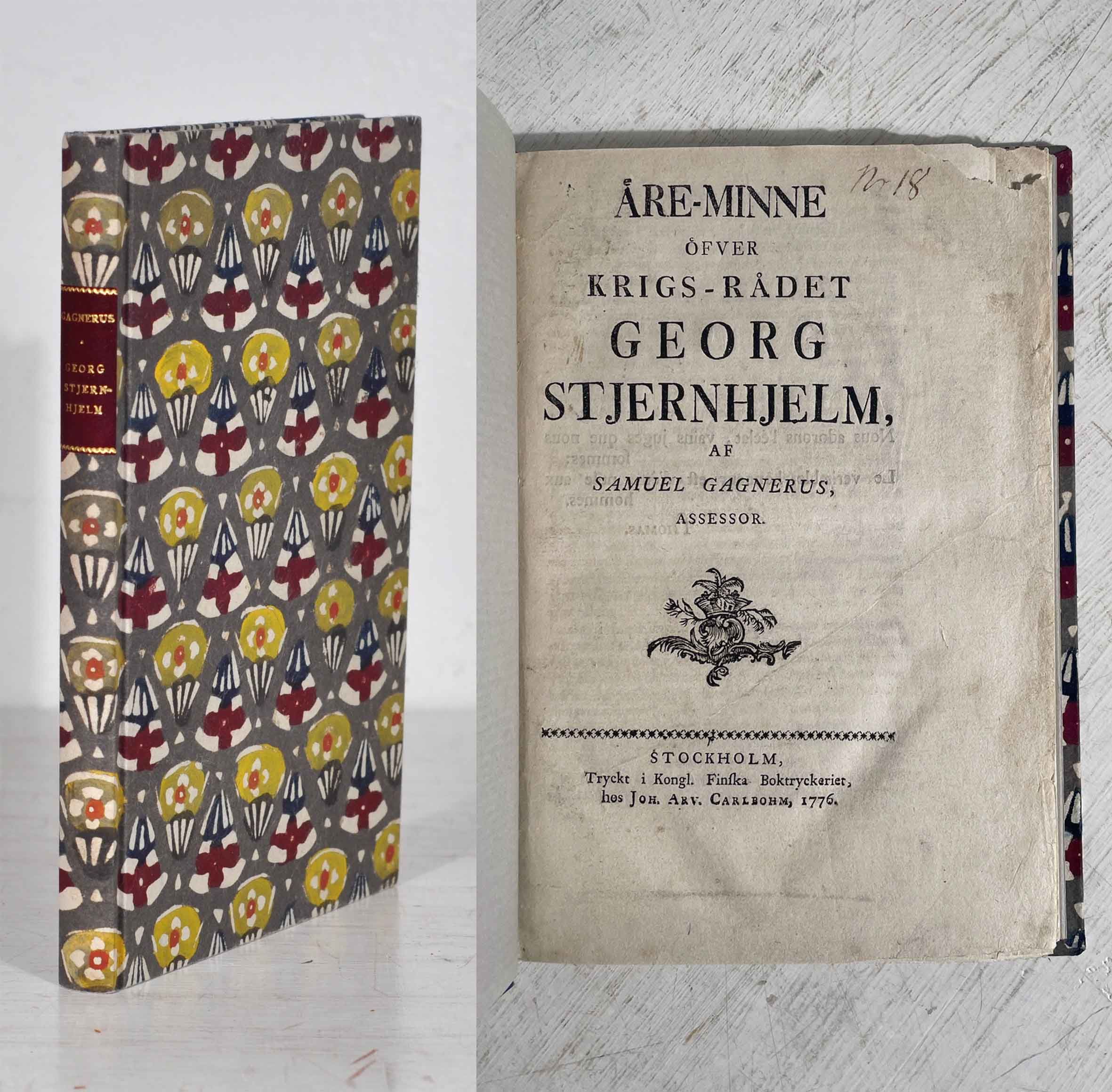 Sthlm, Kongl. finska boktryckeriet, hos J. A. Carlbohm, 1776. 8:o. (8),136 s. Nyare pappbd med schablonmålade dekorfigurer i blått, vitt, rött, grönt, svart och orange på grå botten samt titeletikett av rödbrunt skinn. Helt oskuren och endast putsad inlaga. Smärre pappersförluster i övre hörnet på de två första bladen. Brun liten fläck i texten på sista bladet. Författaren säger i sitt förord att ”Mödan vid elogers utarbetande torde eljest i Sverige altid blifva större, än man sig i almänhet föreställer, så länge man här saknar fullständige förut utarbetade biographier och tilräckeliga historiske uplysningar, hvilka altid böra ligga til grund för et äre-minne, såsom en duk för en målning”. Samuel Gagnerus (1731-91) utgav också tillsammans med Gjörwell ”Swenska magasinet” 1767-69.