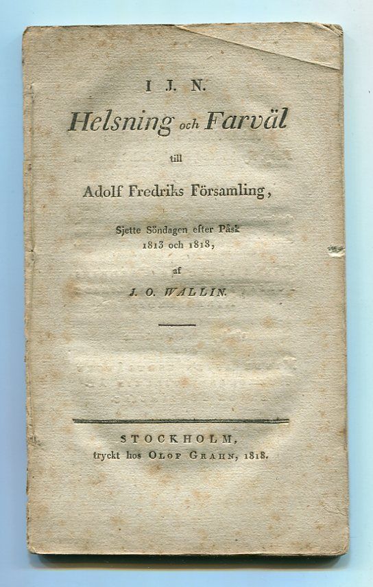 Sthlm, O. Grahn, 1816. 12:o. XXIV,334,(2 blanka) s. Häftad och oskuren i samtida gult glättat pappomslag med handskriven titel både på ryggen och främre omslaget. Ryggen nött och med skador upp- och nedtill. Något lagerfläckig i början, därefter spridda småfläckar. Fuktfläck i övre hörnet från s. 267. Liten reva nedtill på titelbladet, övre hörnet med revor i s. 41-44, smårevor i nedre marginalen på s. 75 och 107 samt längre revor i s. 153-54 respektive 179-80. Det sista blanka bladet är uppklistrat mot bakre omslaget. Louise Moréns överstrukna namnteckning. Joh. Nilssons namnteckning överst på titelbladet och tillsammans med titeln på främre omslaget. Bra och ovanligt skick! Efter en lång rad psalm- och psalmboksförslag blev detta förslag, med en del förändringar, antaget och grunden för 1819 års psalmbok. Wallin hade skrivit en rad psalmer själv och omarbetat ännu fler.