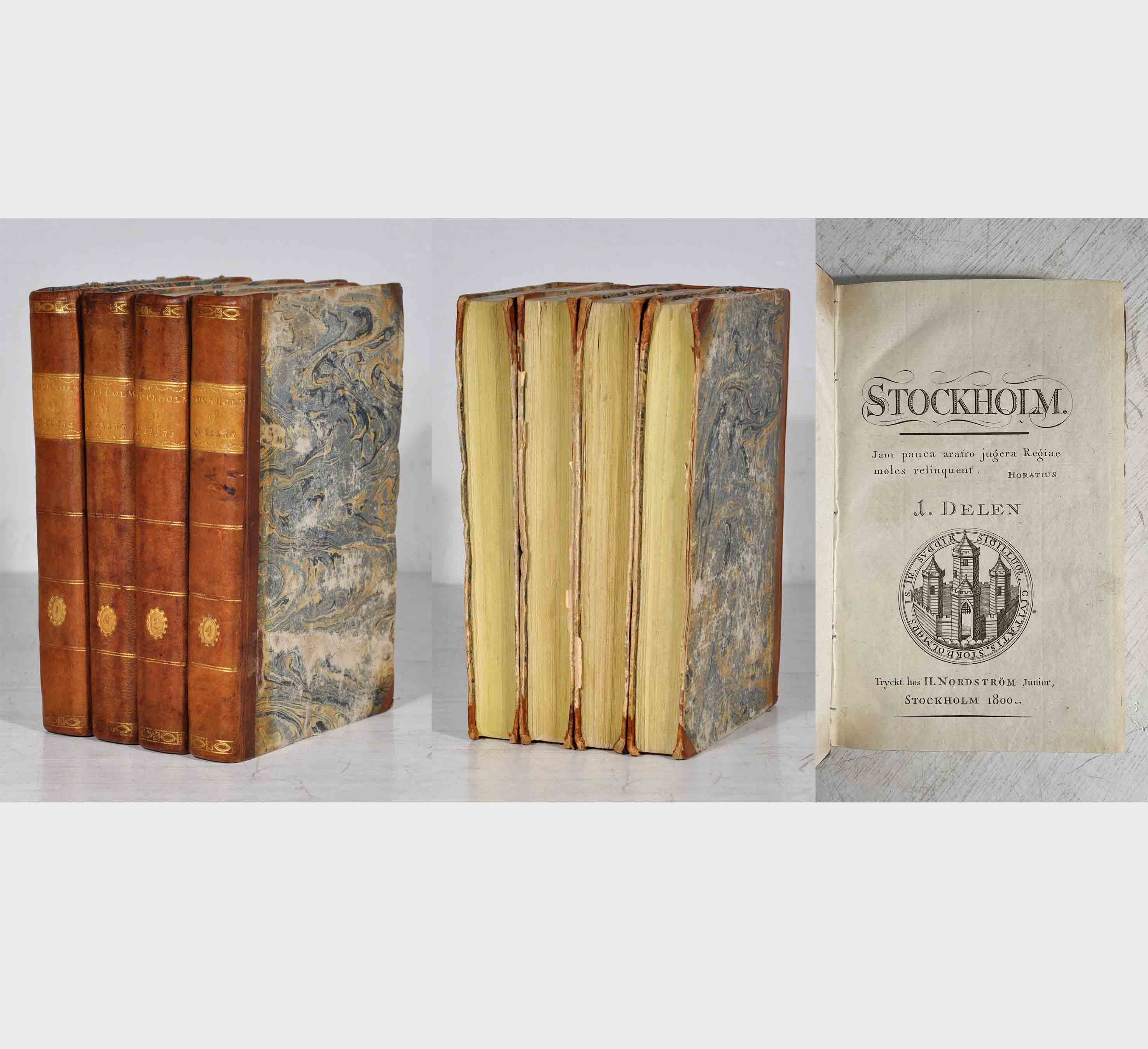 Sthlm, H. Nordström junior, 1800-01. 8:o. Grav. titelblad,(16),378,(13) s. + grav. titelblad,(4),382,(17) s. + grav. titelblad,(6),382,(1,1 blank,20) s. + grav. titelblad,(4),387,(13) s. Fyra samtida obetydligt nötta marmorerade hfrbd med guldornerade ryggar, olivgröna titeletiketter och ovala olivgröna nummerskyltar. Gula snitt. Lite flammiga ryggar och stötta pärmhörn. Den sista volymen med några små repor och svarta stänk i ett av ryggfälten samt mer nötta pärmpapper. Ett fåtal små lagerfläckar, t.ex. i början av del III. Bra svit. Bygdén Landskapet Uplands och Stockholms stad s. 53. Setterwall Svensk historisk bibliografi 5968. Akrell Stockholmiana 852-855. Författaren och kulturhistorikern Johan Elers huvudarbete. Elers (1730-1813) hade redan 1792 påbörjat sitt arbete om Stockholms historia och länge försökt att värva även andra skribenter till ett samarbete. Så skedde emellertid inte och den väldiga uppgiften utfördes av Elers ensam – i ett brev till vännen och samlaren Samuel Älf 1798 skriver Elers att ”Stockholms historia är min dageliga ockupation”. ”Svenskt biografiskt lexikon” skriver om verket att tyngdpunkten ”lagts på de topografiska förhållandena, men vidsträckt utrymme ägnas också åt folkmängd, förvaltning, historiska händelser och institutionshistoria”. Elers byggde i stor utsträckning sin skildring på otryckt material från exempelvis Riksarkivet, Stadsarkivet och Kammarkollegiet.