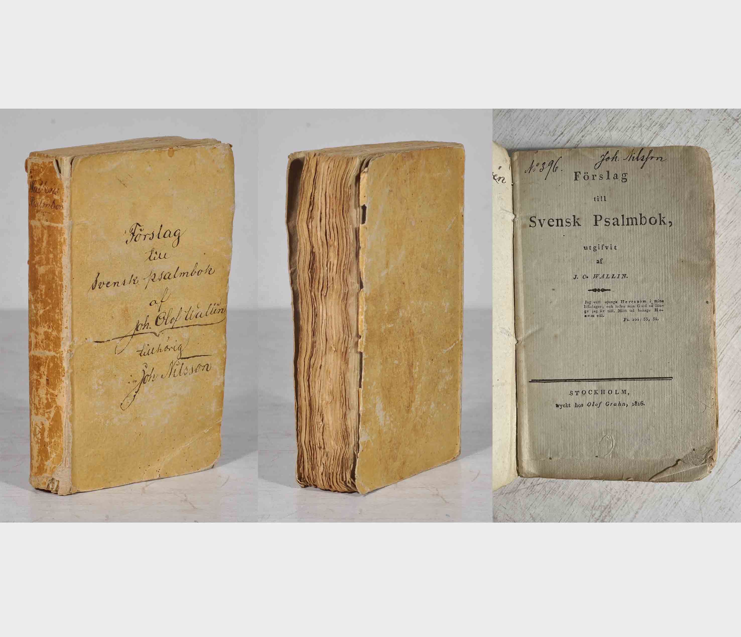 Sthlm, O. Grahn, 1816. 12:o. XXIV,334,(2 blanka) s. Häftad och oskuren i samtida gult glättat pappomslag med handskriven titel både på ryggen och främre omslaget. Ryggen nött och med skador upp- och nedtill. Något lagerfläckig i början, därefter spridda småfläckar. Fuktfläck i övre hörnet från s. 267. Liten reva nedtill på titelbladet, övre hörnet med revor i s. 41-44, smårevor i nedre marginalen på s. 75 och 107 samt längre revor i s. 153-54 respektive 179-80. Det sista blanka bladet är uppklistrat mot bakre omslaget. Louise Moréns överstrukna namnteckning. Joh. Nilssons namnteckning överst på titelbladet och tillsammans med titeln på främre omslaget. Bra och ovanligt skick! Efter en lång rad psalm- och psalmboksförslag blev detta förslag, med en del förändringar, antaget och grunden för 1819 års psalmbok. Wallin hade skrivit en rad psalmer själv och omarbetat ännu fler.