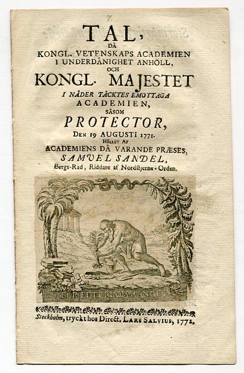Sthlm, L. Salvius, 1772. 8:o. (4) s. Med en inklistrad grav. titelvinjett. Tagen ur band.