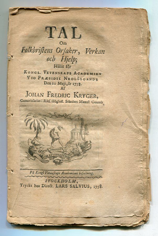 Med ett svarstal av Vetenskapsakademiens sekreterare Pehr Wargentin. Bristen på innevånare var enligt det rådande synsättet det största hindret mot Sveriges ekonomiska uppblomstring. Fler människor skulle kunna både producera och efterfråga fler varor. Kryger återkom 1763 till ämnet i ett svar till Vetenskapskademien på deras fråga: ”Hvad kan vara orsaken, at sådan myckenhet svenskt folk årligen flytter ur landet?” Johan Fredric Kryger (1707-77) var anställd vid Manufakturkontoret och ledamot av Vetenskapsakademien. Han är en av de flitigaste deltagarna i den ekonomiska debatten i Sverige under frihetstiden, både med flera egna tidskrifter och en mängd broschyrer.