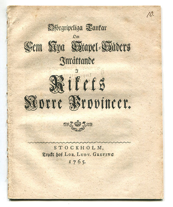 Sthlm, L. L. Grefing, 1765. 4:o. 27 s. Tagen ur band. Gamla stänkta snitt. Obetydliga lagerfläckar. Titelsidan med gammal bläcknumrering ”10”. Bra ex.