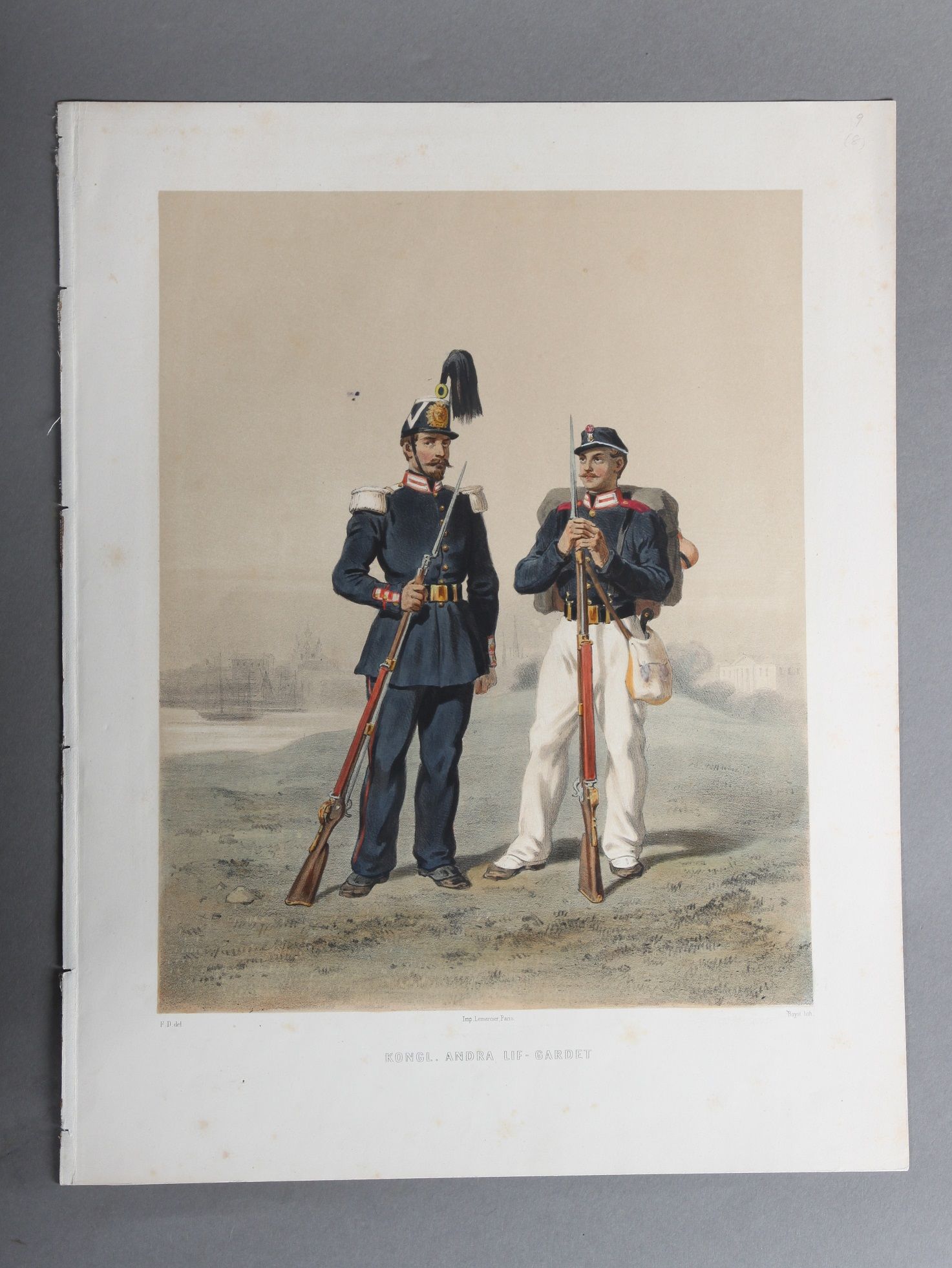 Kongl. Andra Lif-Gardet. Håndkolorert liografert plansje av Bayot etter tegning av Dardel.