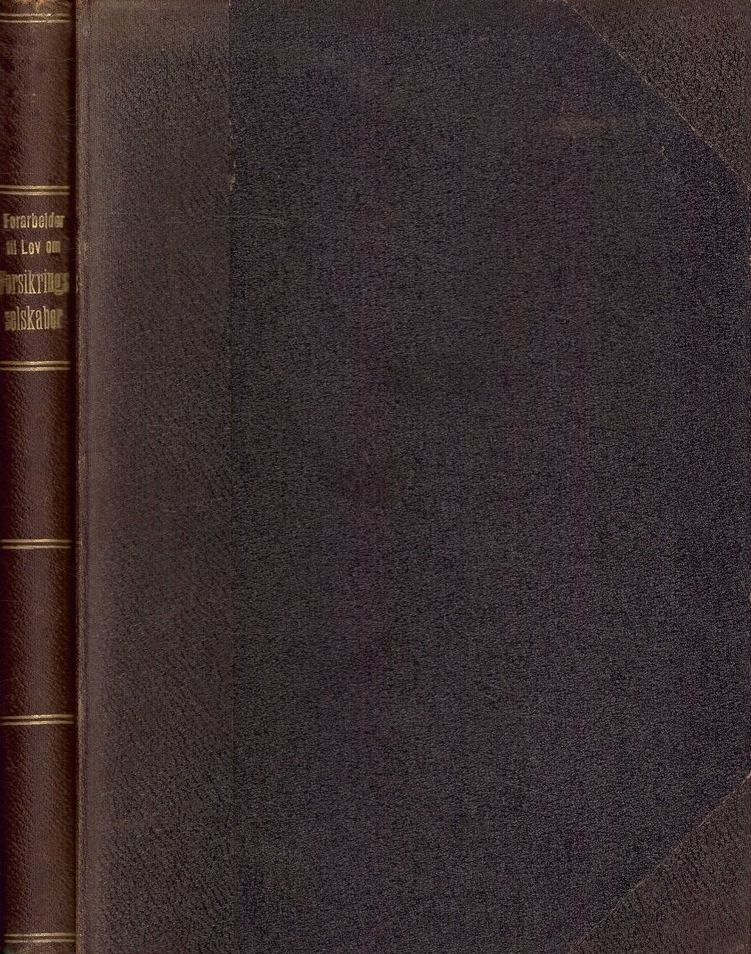 Christiania 1895. Liten 4to. 107, [1] s. / Ot. prp. nr. 30. (1900-1901). Ang. udfærdigelse af en lov om forsikringsselskaber. Kristiania 1901. Liten 4to. 28 s. / Ot. prp. nr. 7. (1904-1905). Ang. udfærdigelse af en lov om forsikringsselskaber. Kristiania 1905. Liten 4to. 27, [1] s. / Ot. prp. nr. 14. (1910). Om udfærdigelse av en lov om forsikringsselskaber. Kristiania 1910. Liten 4to. 59, [1] s. / Indst. O. XI. (1910). Indstilling fra den forsterkede justiskomite angaaende den kongelige proposition til lov om forsikringsselskaper. (Ot. prp. nr. 14, dok. nr. 54). Kristiania 1910. Liten 4to. 41, [1] s. Bundet i et samtidig, litt falmet, granitolryggb. Øvre kapitél med sår. Enkelte små rifter.. .