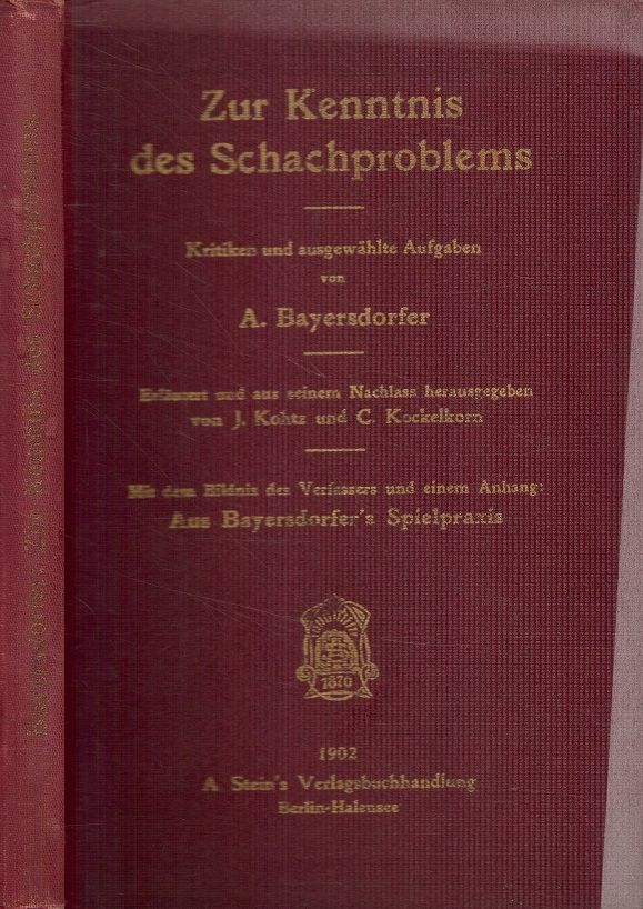 Zur Kenntnis des Schachproblems. Kritiken und ausgewählte Aufgaben, von ... Erläutert und aus seinem Nachlass herausgegeben von J. Kohtz und C. Kockelkorn. Mit dem Bildnis des Verfassers und einem Anhang: Aus Bayersdorfer’s Spielpraxis. A. Stein’s Verlagsbuchhandlung,