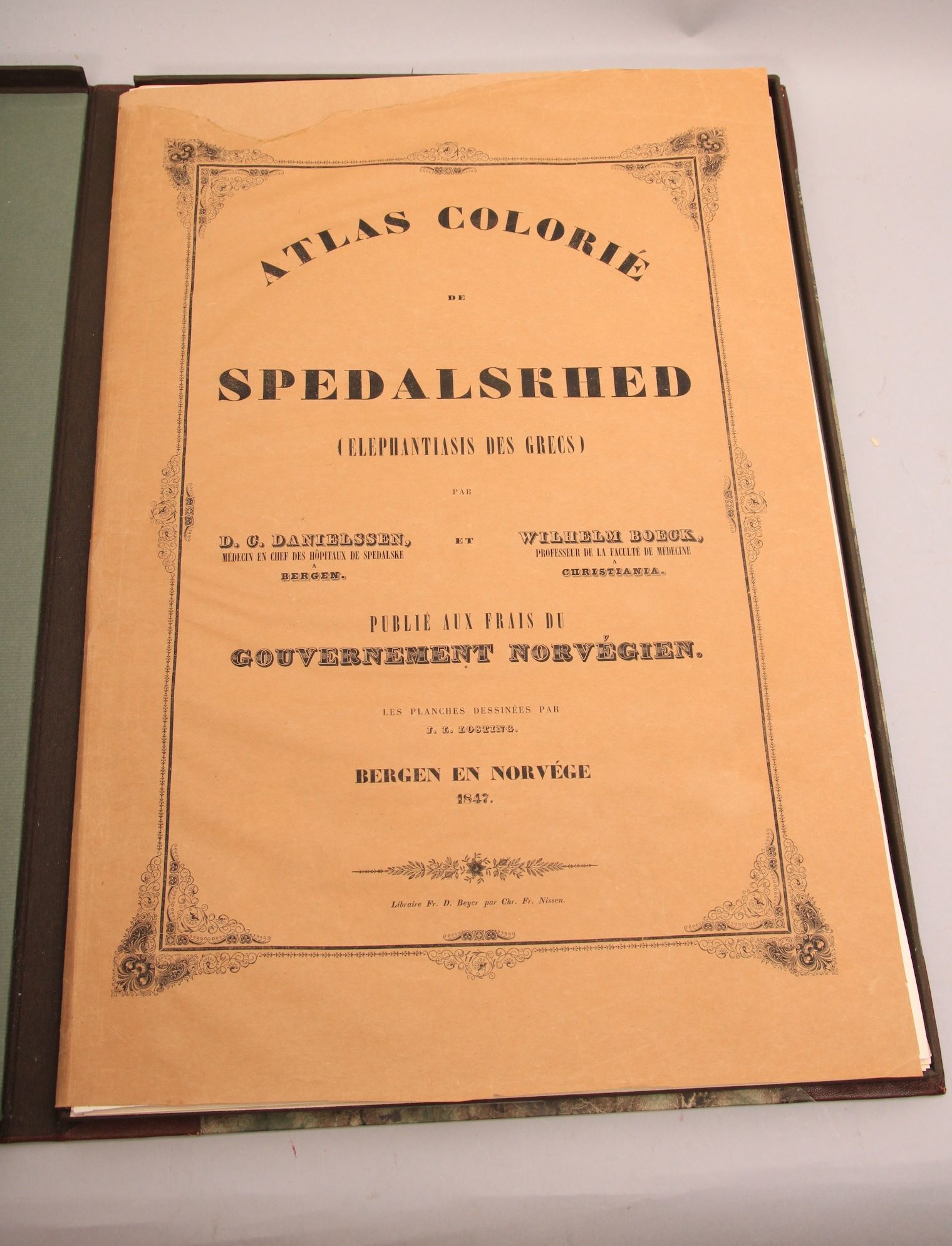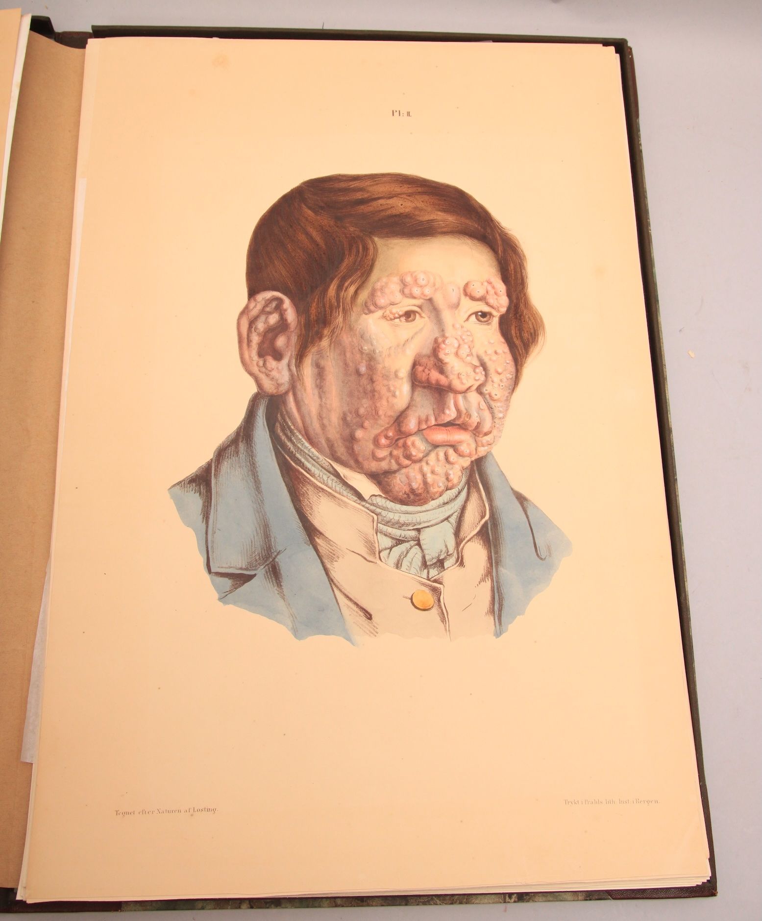 Bergen, Fr. D. Beyer par Chr. Fr. Nissen, 1847. Folio (500 x 335 mm). Title-page, 24 lithographic plates in colour after Johan Ludvig Lostings drawings, printed in Prahls lith. Inst. in Bergen. Original publisher’s wrappers. Wrapper neatly restored. Plates with very light foxing. The leaf with explanatory text not present here, otherwise complete and in fine condition. Preserved in modern leather box. Atlas only. Rare and influential work on Leprosy.. .