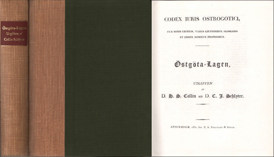 ÖSTGÖTA-LAGEN, Edited by H. S. Collin and C. J. Schlyter. Facsimile edition with addendum by the main part of Emil Olson, Östgötalagens 1300-talsfragment and Carl Ivar Ståhle, De Liedgrenska fragmenten av Östgötalagens C-text.
