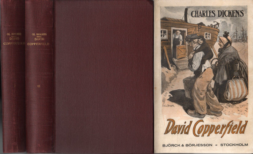 Översättning från engelskan av H. Flygare. Stockholm: Björck & Börjesson, 1923. Andra svenska upplagan av denna utgåva. 934 s. 2 volymer i privatbundna klotband med obetydliga bruksspår, båda främre omslagen medbundna. Med inklistrat vykort föreställande Charles Dickens på det klistrade försättsbladet i första delen.