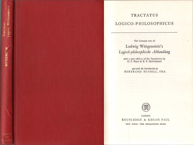 The German text of Logisch-Philosophische Abhandlung with a new edition of the Translation by D. F. Pears & B. F. McGuinness and with the introduction by Bertrand Russell. London: Routledge & Keegan Paul, 1974. Reprint. XXII, 166 pp. Publisher's cloth. Without dust jacket. With name inscription on endpaper. With some underlinings. ISBN 0710030045