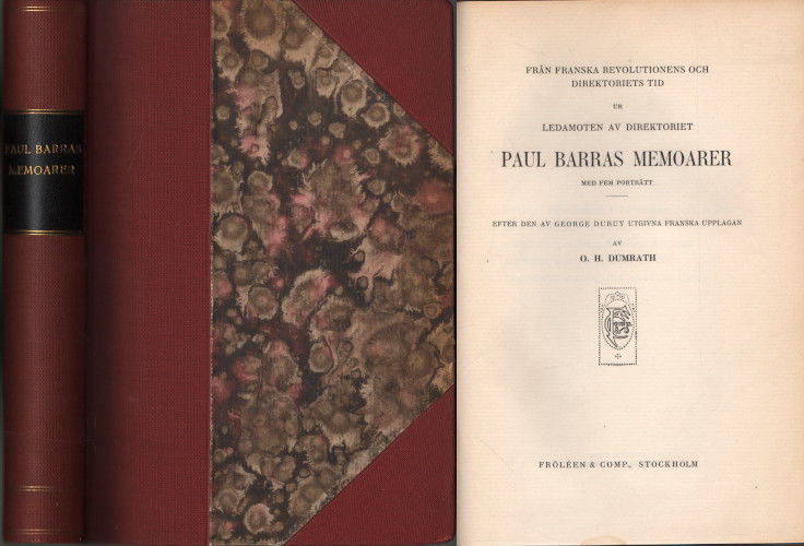Stockholm: Fröléen, 1916. VIII, 400 s + planscher. Privatbundet halvklotband. Illustrerad med fem svartvita porträtt (Barras / Danton / Robespierre / Joséphine / Talleyrand).