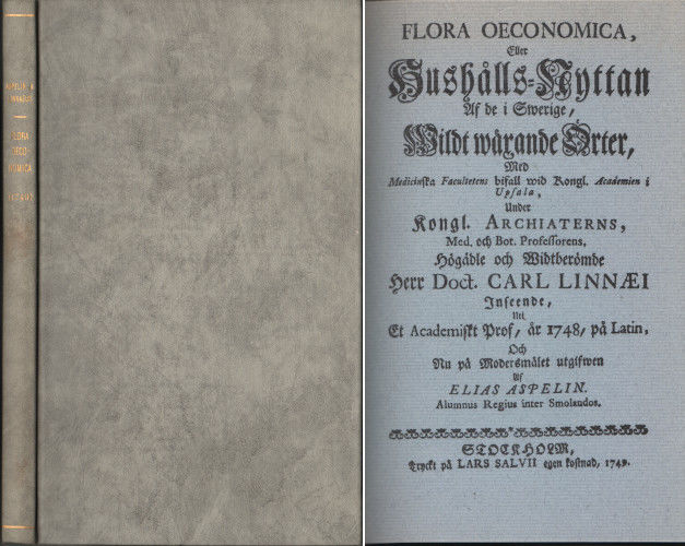 Under Carl Linnæi inseende uti et academiskt prof, år 1748 på latin, och nu på modersmålet utgifwen af Elis Aspelin. Stockholm: Rediviva, 1971. Faksimil efter 1749 års utgåva. (3), 83, (1) s. Privatbundet pappband, omslaget medbundet. ISBN 9171200045