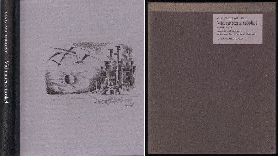 Dikter i urval. Förord av Karl Vennberg. Stockholm: Litteraturfrämjandet, 1983. Bibliofilupplaga tryckt i 300 numrerade exemplar. Detta exemplar saknar den signerade originallitografin av Gunnar Brusewitz. 147, (5) s. 23,5x20 cm. Inbunden i förlagets tryckta pappband med skinnrygg med övre guldsnitt i skyddskassett av papp (24x20 cm). Illustrerad med svartvita teckningar av Gunnar Brusewitz.