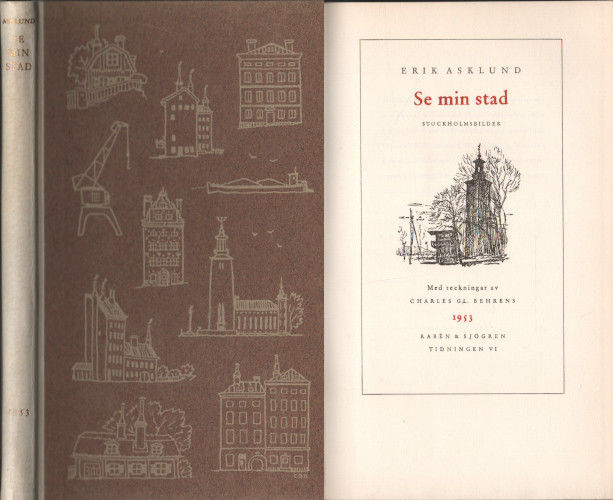 Stockholmsbilder. Stockholm: Rabén & Sjögren/Tidningen Vi, 1953. Delvis med originalbidrag. 149, (1) s. Inbunden i förlagets pergamentryggsband. Utan skyddsomslag. Illustrerad med svartvita teckningar av Charles Gl. Behrens. Med exlibris på det klistrade försättsbladet.