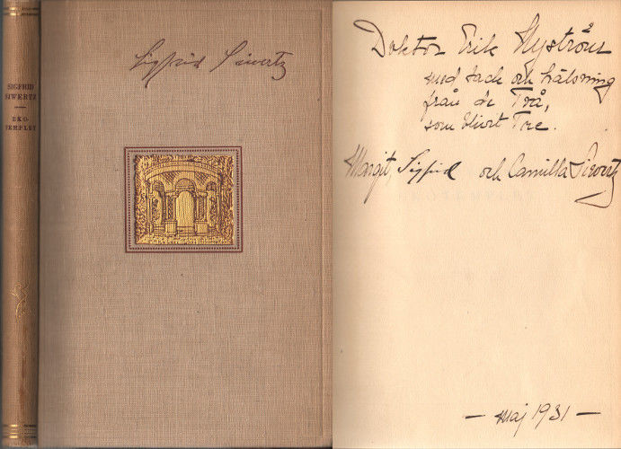 Med dedikation från familjen Siwertz "Doktor Erik Nyström med tack och hälsning från de Två som blivit Tre. Margit, Sigfrid och Camilla Siwertz".