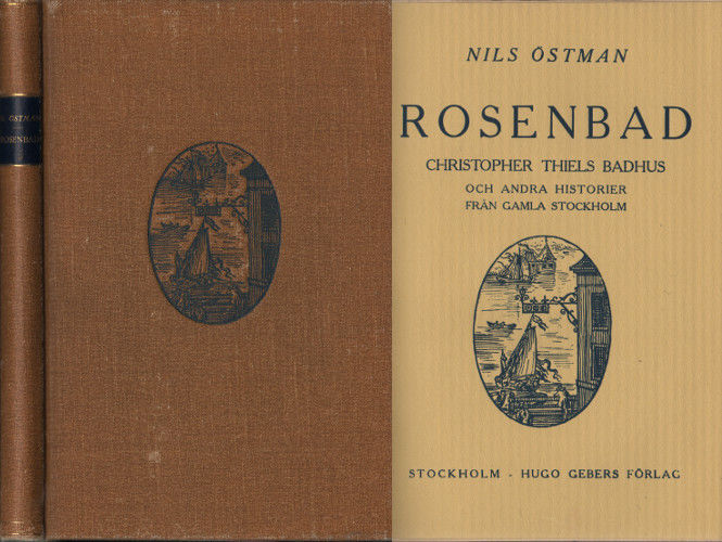 Christopher Thiels badhus och andra historier från gamla Stockholm. Stockholm: Gebers, 1923. VI, (2), 140 s + planscher. Inbunden i förlagets dekorerade klotband med marmorerat helt snitt, främre omslag medbundet. Illustrerad med svartvita planscher.