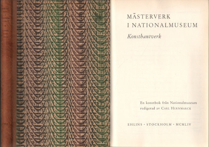 En konstbok från Nationalmuseum redigerad av Carl Hernmarck. Stockholm: Ehlins, 1954. 155, (1) s. 22,5x15,5 cm. Inbunden i förlagets skinnryggsband. Utan skyddsomslag. Illustrerad i svartvitt samt med monterade planscher i färg.