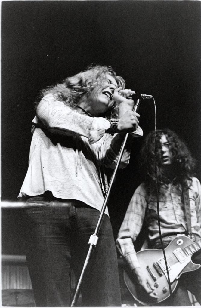 * Led Zeppelin lead singer is just a haystack of hair and rock'n'roll - and so is Jimmy Page in the background. Taken during a concert in Copenhagen on February 28 1970.