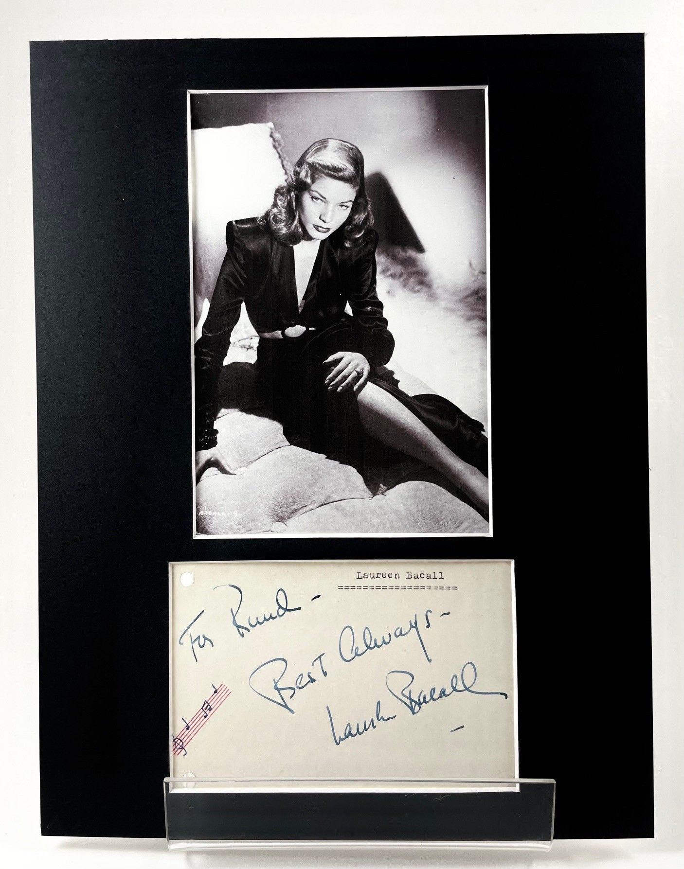 Ink on thin cardboard [14.5 x 10 cm]: 'To Knud - Best Always/ Lauren Bacall'. Name [mis]typed on front. Stamp with date on back [1962]. Filing number and date of death written on back. Some drawn musical notes to the card. Framed in black passepartout [32 x 23.5 cm] with photo.