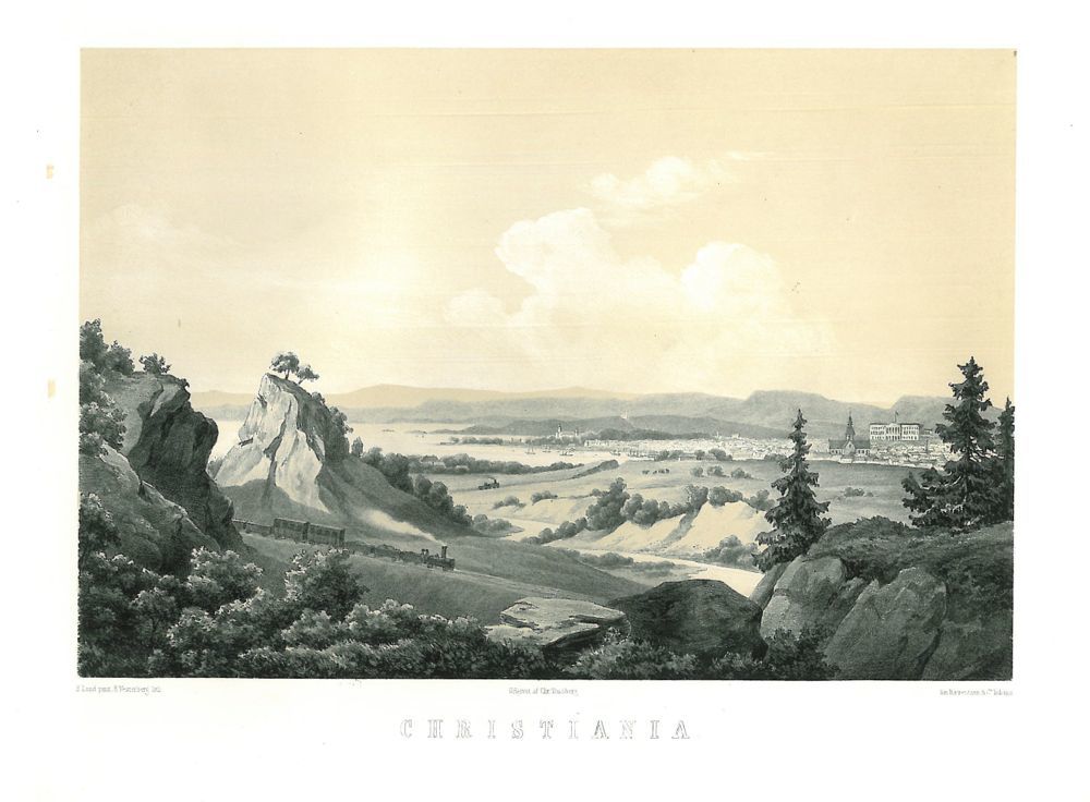 Christiania, 1855. Originalt litografi etter B. Lund. Med senere håndkolorering. Motivets størrelse : 19 cm X 28,2 cm.. (Udgivet af Chr. Tønsberg.) Norsk. Fra Chr. Tønsberg : “Norge fremstillet i Tegninger”. Malt av B. Lund og litografert av E. Vesterberg.
