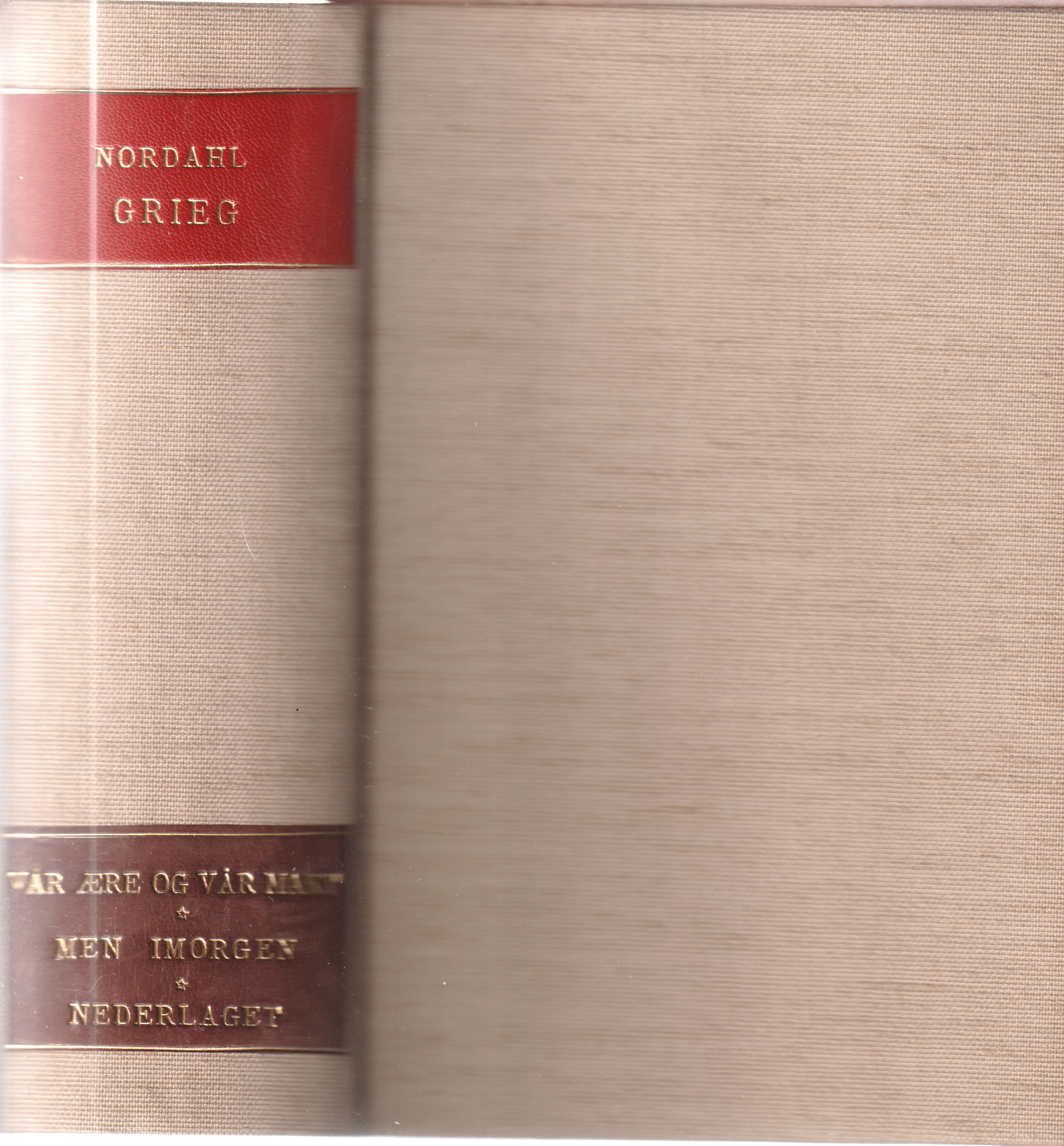 Oslo, 1929. Tekstilbind. Grått. Navn i gull på sort og rødt skinnfelt. Første opplag. Bundet med begge orig. omslag. Meget pen. Ren materie. Dedikasjonseksemplar til “Gunnar Fredriksen med hjertelig hilsen fra Nordahl Grieg 4. nov. 1929” signert av forfatteren. Bundet av Alex Masui, Mechelen. (Gyldendal Norsk Forlag) 137 s. .