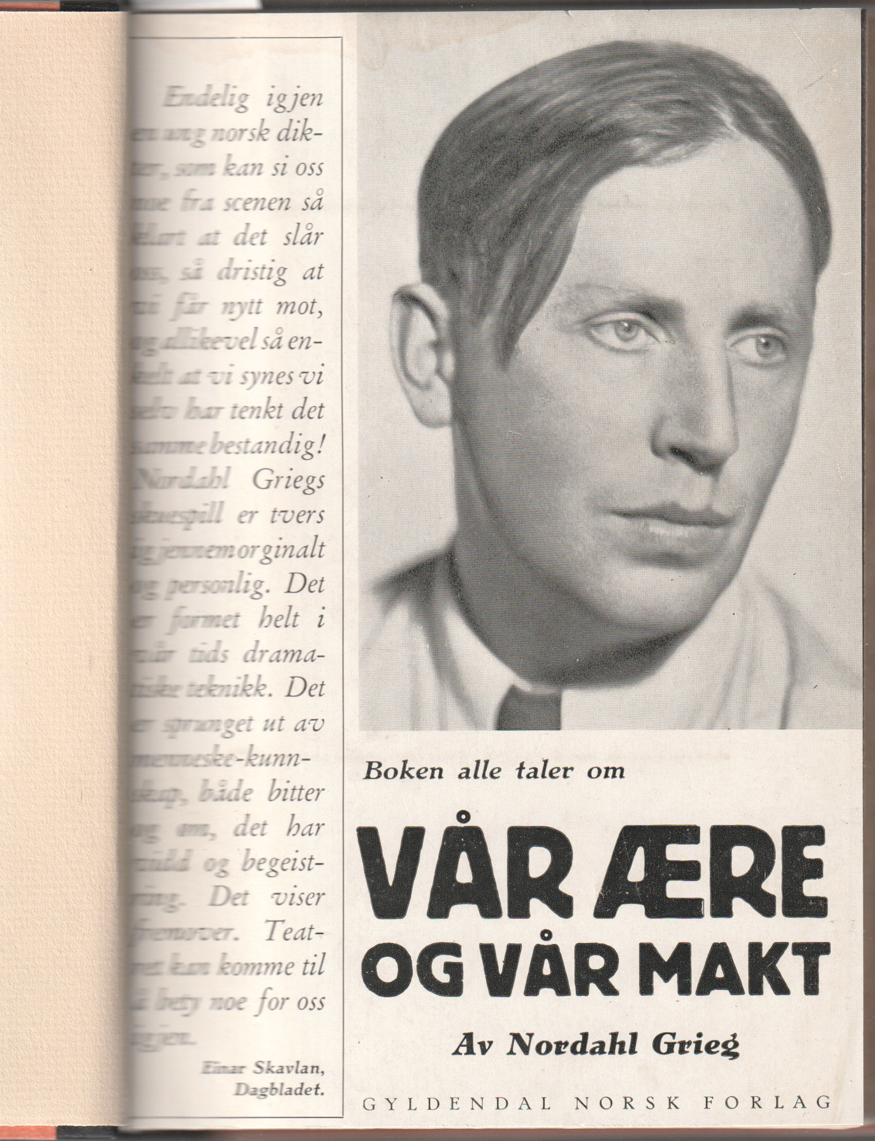 Oslo, 1929. Tekstilbind. Grått. Navn i gull på sort og rødt skinnfelt. Første opplag. Bundet med begge orig. omslag. Meget pen. Ren materie. Dedikasjonseksemplar til “Gunnar Fredriksen med hjertelig hilsen fra Nordahl Grieg 4. nov. 1929” signert av forfatteren. Bundet av Alex Masui, Mechelen. (Gyldendal Norsk Forlag) 137 s. .