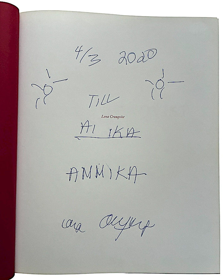 Galleri Lars Bohman, Stockholm. 2002. 80 s. (23,5 x 20,5 cm). Rött klotband med välbevarat skyddsomslag. Helsidesillustrationer i färg. Mycket fint skick! Dedikation, och med en originalteckning, till Annika Nordin, (1946-2024), kulturskribent på bl.a. Dagens Nyheter.