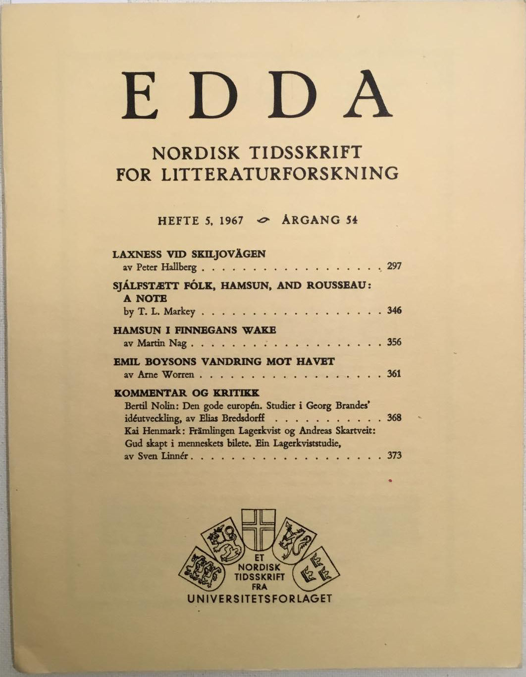 M.a. Laxness ved skiljovegen av Peter Hallberg. Hamsun i Finnegans Wake av Martin Nag. Tekst på svensk, engelsk og bokmål