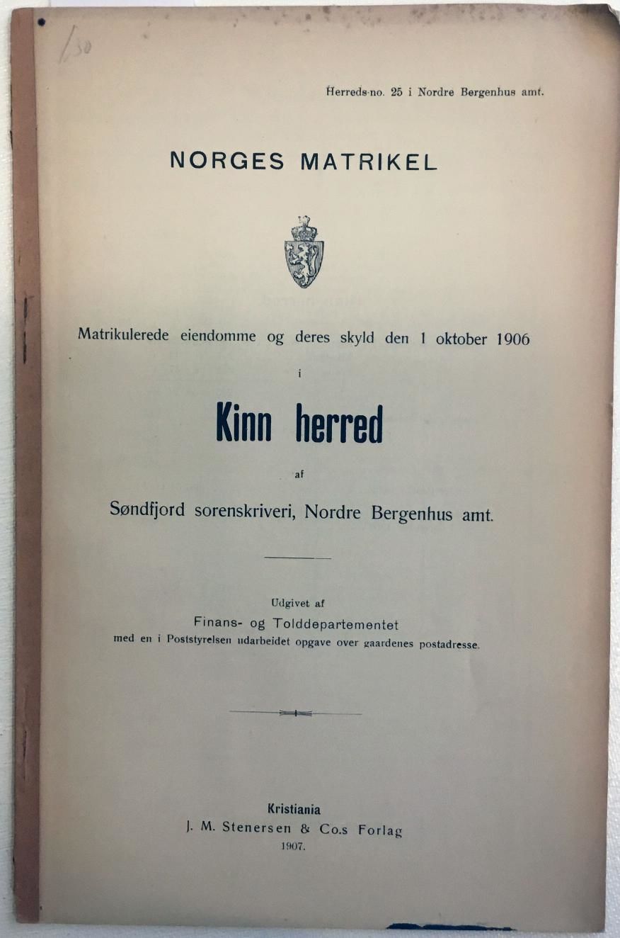 Matrikulerede eiendome og deres skyld den 1 oktober 1906 i Kinn herred af Søndfjord sorenskriveri, Nordre Bergenhus amt