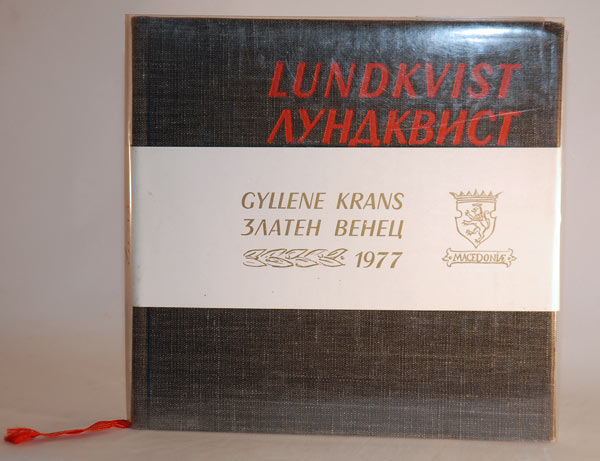 Skopje; Förlaget Tanke, 1977. [20x21 cm]. 279, (1 blank) s. + dubbelsidig porträttplansch. Förlagets linneband gördel samt transparent plastomslag, det senare med små förluster vid hörnen. Gördeln med en obetydlig skrynkling. Ryggfoten lätt tilltryckt. Fin inlaga. Med två bilagda tidningsurklipp som rör Lundkvist. Boken utgavs i samband med Poesifestivalen i Struga, makedonien, där Lundkvist detta år mottog festivalens pris. Hans tacktal är medtaget i boken. Svensk och makedonsk Parallelltext. Med en dedikation från Lundkvist till vännen Lütfi Özkök, skriven på porträttplanschen.