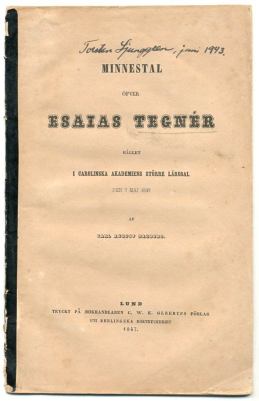 Lund; tryckt på bokhandlaren C. W. K. Gleerups förlag, 1847. 20,5x13 cm. (1, 1 blank), 31, (1 blank) s. Svart pappersryggremsa. Med Torsten Ljunggrens namnteckning på titelbladet. Ryggremsan med mindre förluster. Kort reva i titelbladets övre marginal. Genomgående lätt fläckad.