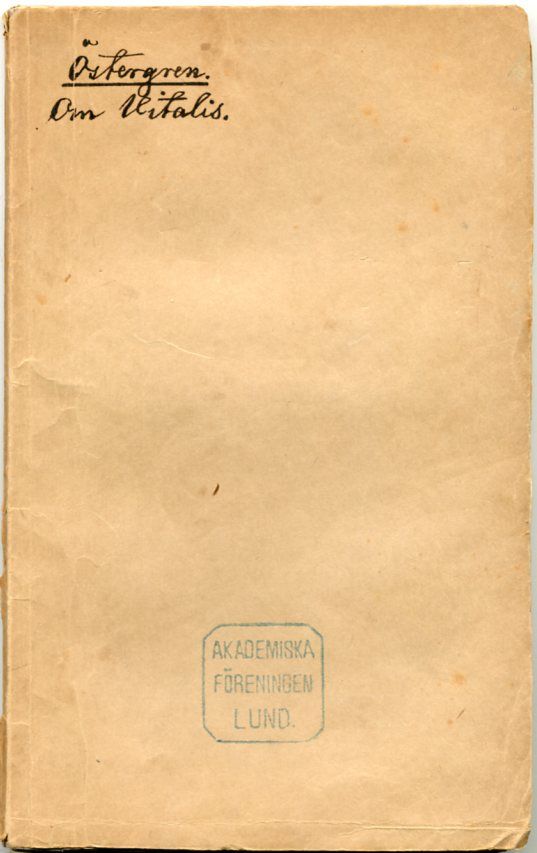 Uppsala; Edquist & Berglund, 1869. Diss. 22,5x14 cm. (1, 1 blank), 95, (1 blank) s. Häftad med samtida blankt omslag. Främre omslag med handskriven titel samt stämpel för Akademiska Föreningen i Lund. Ryggen något revid, några fläckar på bakre omslag. Inlagan genomgående lätt fläckad. De sista fyra bladen aningen skrynklade. Pseudonymen Vitalis användes av författaren Erik Sjöberg (1794-1828).