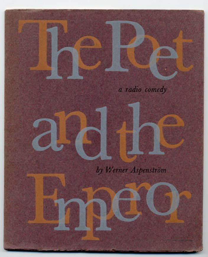 Stockholm; Sveriges Radio, The Swedish Broadcasting Company, 1956. 21,5x18 cm. (26, 2 blanks) pp. Original printed wrappers. There is a short tear at lower front joint. Corners are a trifle worn. The oversized wrappers are slightly creased in lower margins. Translation of the play ""Poeten och kejsaren"" by Paul Britten Austin. The play was first perfomed in Swedish in 1956.